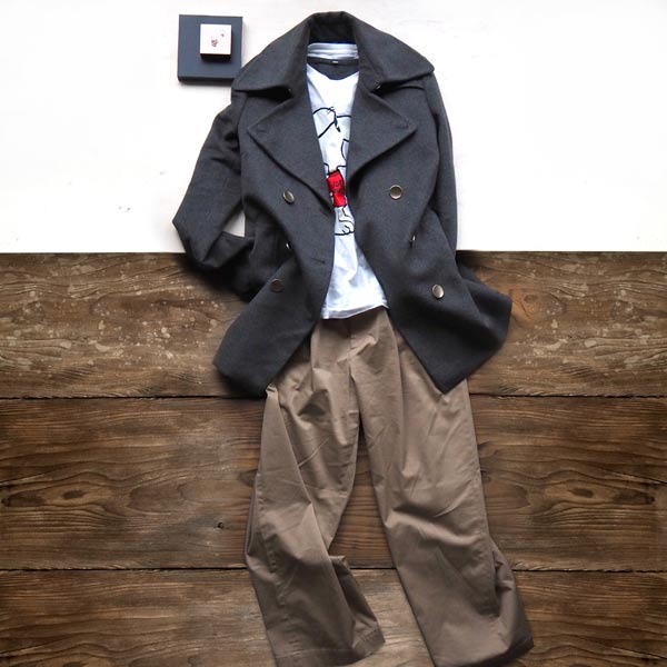 今日のコーデは、ワイドチノとTシャツでインナーはカジュアルに。